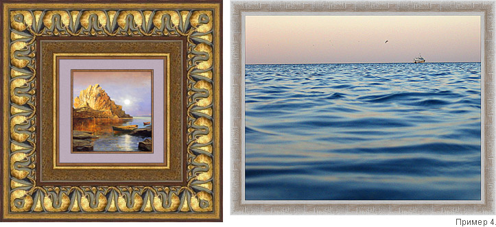 Крайне желательно, чтобы багет сочетался с картиной (работой) по цветовой гамме и был на пол тона темнее или светлее от преобладающего цвета картины (работы). Багет и картина должны гармонично дополнять друг друга, а не соперничать между собой. Живопись с преобладанием теплых тонов оформляются в багет (раму) теплых оттенков, а холодных – в багет (раму) с холодными оттенками (Пример 2, Автор: Миронов Геннадий).